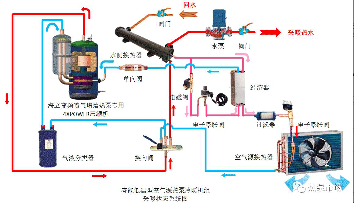 低溫空氣源熱泵一般采用“五大件”設(shè)計(jì),由空調(diào)的“四大件”的單一系統(tǒng)變成了帶噴氣增焓的雙系統(tǒng),低溫制熱效果更好,性能系數(shù)更高;